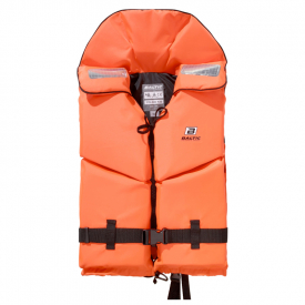 Denne redningsvesten har delte frontpaneler for bedre passform og er utstyrt med retro-reflekterende lapper, fløyte, nylon glidelås foran, justerbar linning, topp- og bunnslips.