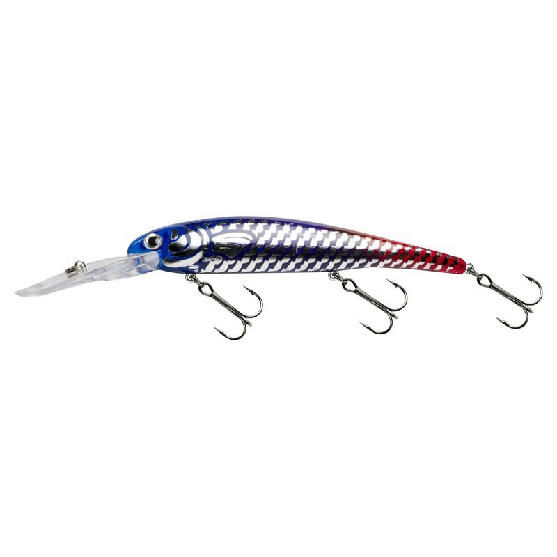 Djupgående wobbler med 2. gjennomgående hål for innsetting av lysstavar, noe som gjør den utrolig synlig og attraktiv når den dykker ned på 8 meters dyp.