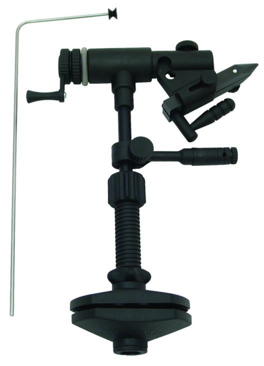 Fordelen med denne skrustikken er at du kan rotere chucken og krokakselen er fortsatt i samme horisontale nivå uten å slingre som betyr "ekte roterende". < br /> Chucken er laget av herdet svensk stål og roterer lagrene med justerbar motstand, kan håndtere #6/0 - #24 krokstørrelser. Alle andre deler er laget av komposittmateriale, Leveres med snelleholderstativ og teleskoparm som standard.