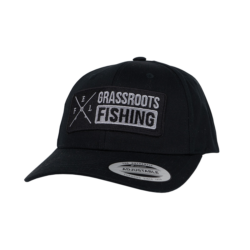Svart Yupoong snapback med buet visir og brodert lapp, stilig design.