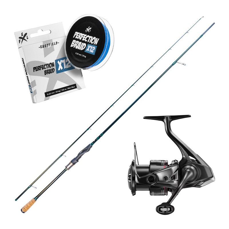 Stangen i British Racing Green har rask aksjon og kastevekt 3–20 g. Det gir presise kast med lette jigs, ned rig, små crankbait og tailspin, både fra båt og land. Tigerkork-håndtaket gir godt grep gjennom hele økta. Shimano Vanford FA 2500 er en lett haspelsnelle i Ci4+ med jevn brems og svært lav startmotstand, noe som er gull verdt når det fiskes med lette baits og tynne liner. Eastfield Perfection Braid X12 kompletterer comboen med en stille, glatt 12-tråds flette som gir lang kastelengde og tydelig kontakt med betet. En allround finesse-kombo for abbor, som også tåler å strekkes mot gjedde når det trengs.