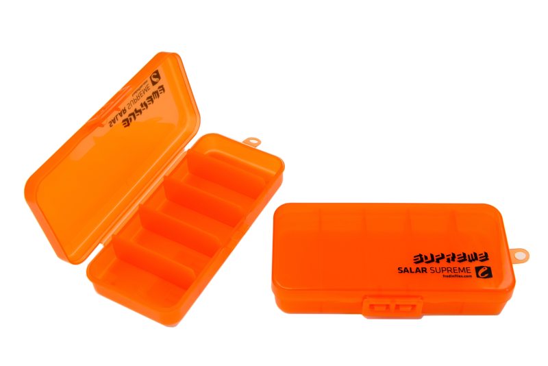 Den har fem like store rom, perfekt for tørrfluer, mikroer eller kun til bruk som krokboks. Dimensjoner: 14x6x2. 5 cm. – Slitesterk høykvalitets plast – Kul synlig oransje farge – Glatt å oppbevare i lommene