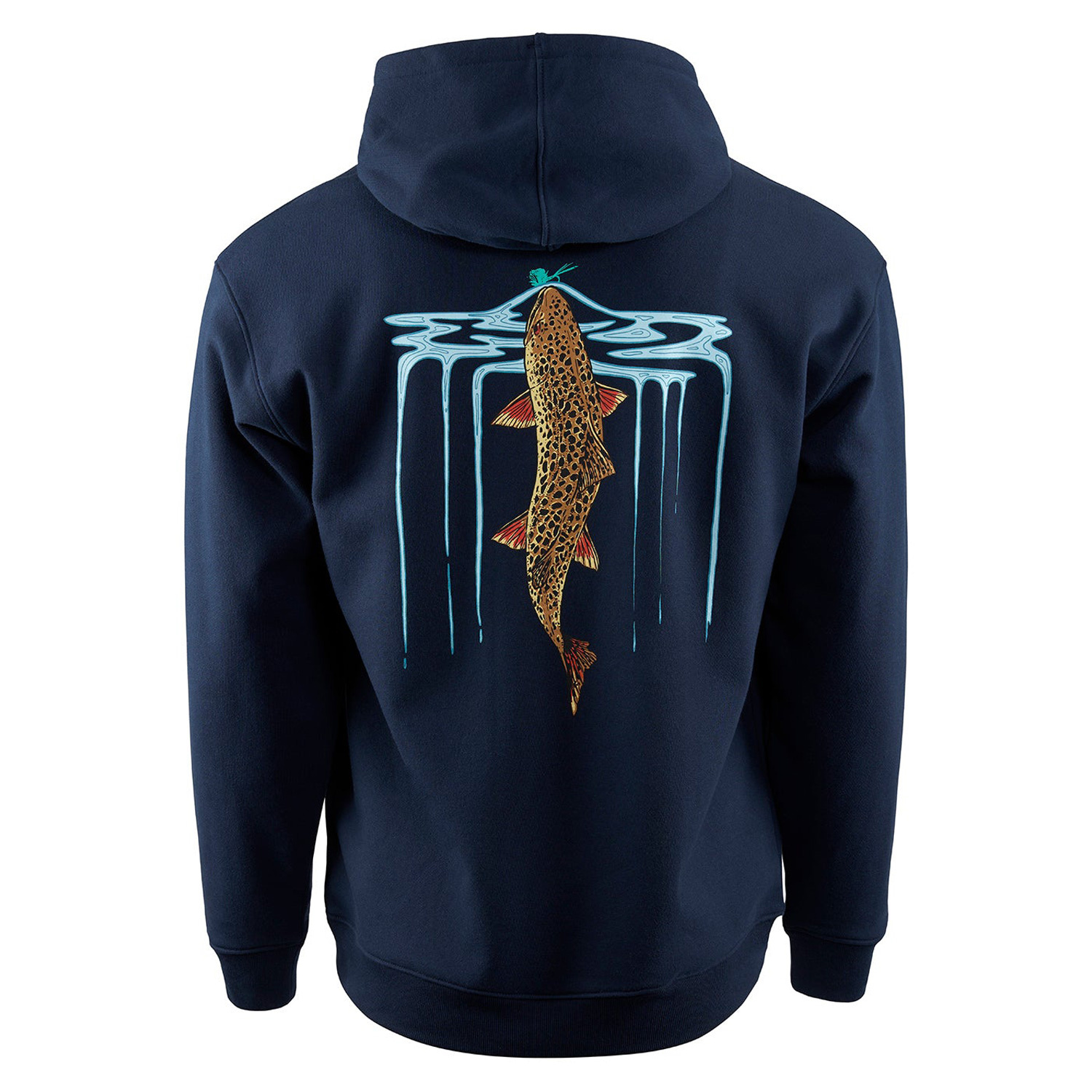 Grundéns Riser Hoodie fanger den magiske opplevelsen av å se en brunørret ta insekter fra vannoverflaten – og utfordringen med å lure den til å velge din flue.