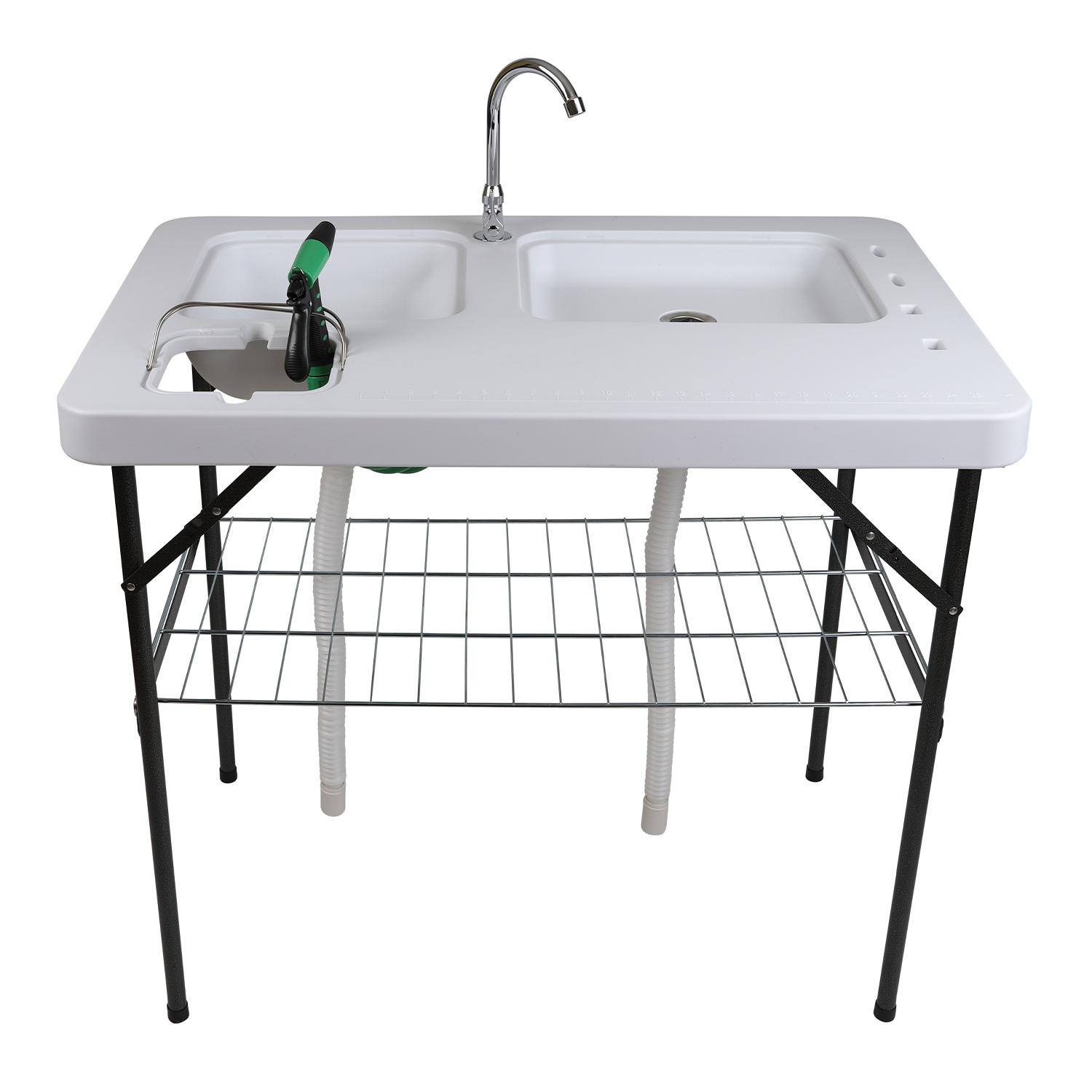IFISH Arbetsbord er den ideelle følgesvennen på fisketurer, med en solid, sammenleggbar arbeidsstasjon som er perfekt for rengjøring av fangsten eller matlaging utendørs. Bordet er laget av slitesterk plast og har to romslige vasker med lokk, en praktisk kran og en slange med en praktisk Gardena-kobling som sørger for sømløs vannstrøm. I tillegg er det en praktisk hylle på undersiden som gir ekstra oppbevaringsplass til alt fiskeutstyret eller matlagingsutstyret ditt. Enten du skal tilberede fersk fisk ved elvebredden eller lage et festmåltid på utekjøkkenet, vil dette bordet på 100 x 65 x 90 cm forbedre utendørsopplevelsen din.