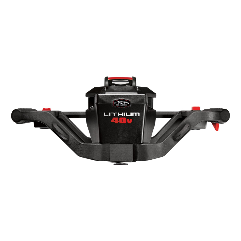 Strikemaster Lithium 40v isborr, Borer 100 hull med 200m bor i en ladning, basert på flere tester på 40cm is. Veldig brukervennlig, for å begynne å bore, trykk bare på en knapp; har både forover- og reversmodus, tilpassede støtdempende håndtak og ergonomiske kontroller med dødmannssikkerhetsbryter og LED-lys.