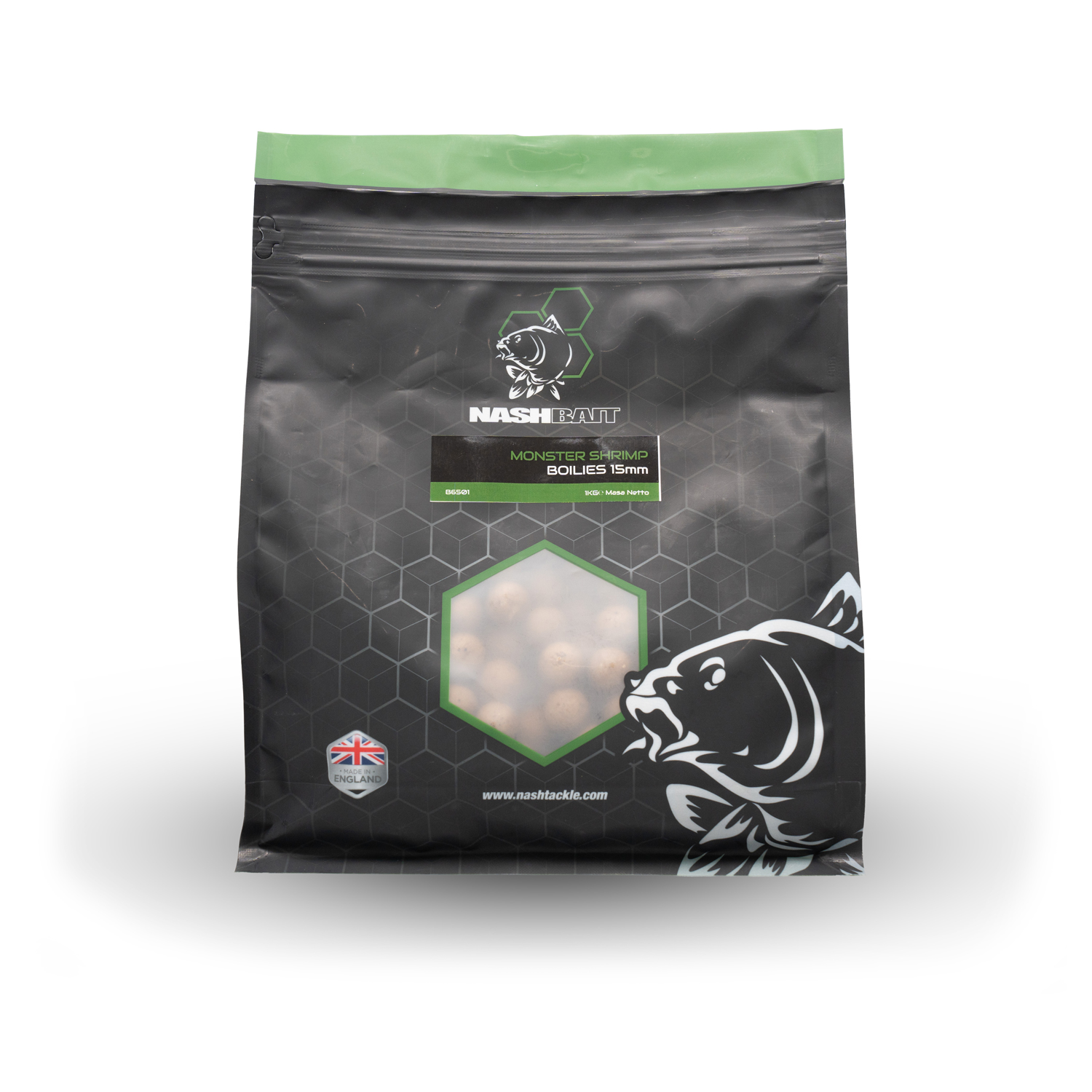 Nash Monster Shrimp Boilies er en næringsrik storfiskboilie med fiskemel, krabbe, hummerolje og Nashbait Salted Shrimp Paste for maksimal tiltrekning.