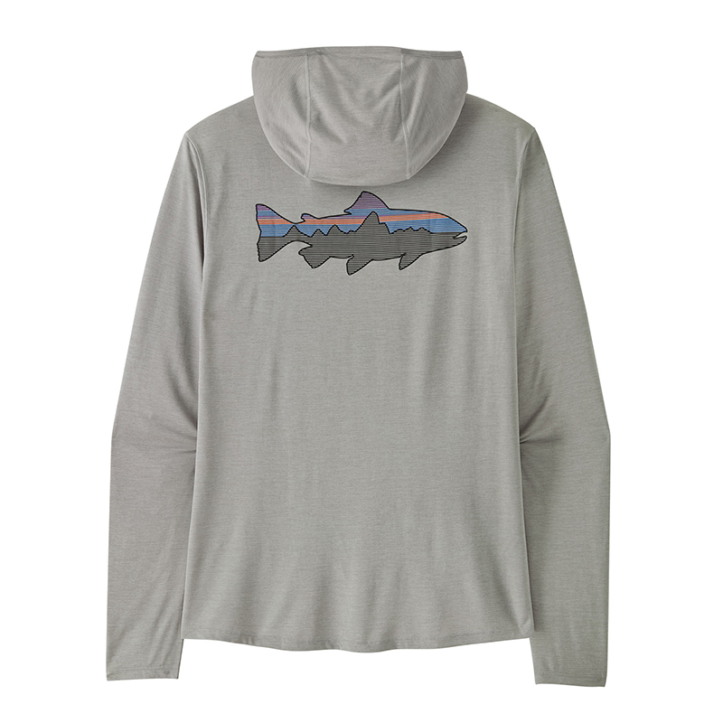 Teknisk solbeskyttende hettegenser med 40+ UPF og Fitz Roy Trout-design – lett, pustende og resirkulert.