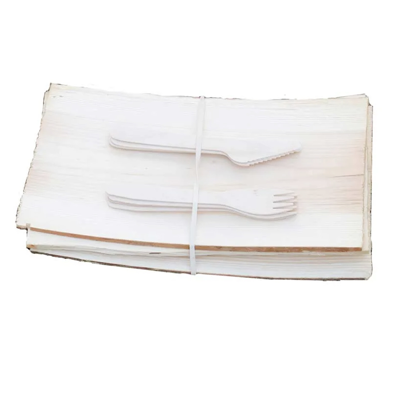 4 tallerkener med trebestikk, 4 kniver og gafler. 8 stykker bestikk.