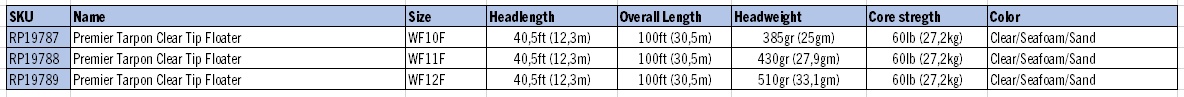 Rio Premier Tarpon Clear Tip Float er designet for tropisk fiske etter store og sky tarpon. Den 10ft lange, gjennomsiktige spissen reduserer risikoen for å skremme fisken og gjør det mulig å bruke kortere fortommer. Med en klassisk tarpon-tapering som kombinerer en medium-lang klump og en kraftig fronttapering, er snøret enkelt å kaste store fluer med, samtidig som det gir presise og lange kast. Bygget på en sterk, medium-stiv kjerne for stabilitet og kontroll, og leveres med to Rio Fly Line Cleaning Towelettes.