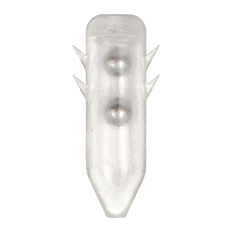 Den spisse formen med små mothaker gjør det lett å presse rista inn i ferdige rattle-slots eller rett i kroppen på softbaiten uten at den løsner igjen. Fire størrelser (S, M, L, XL) gir god mulighet til å tilpasse lydnivå og plassering etter agn og situasjon, fra diskret klirr til tydelig høyfrekvent lyd.