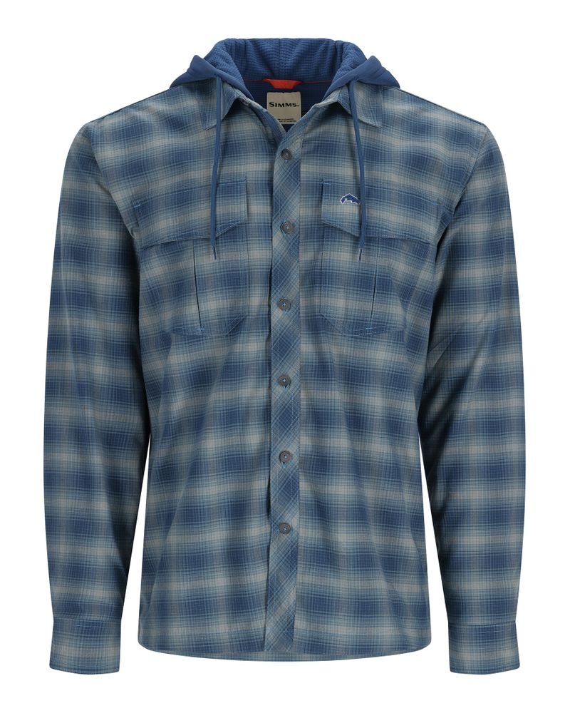 Simms Coldweather Hoody Neptune MC Plaid er en flanellhettejakke med waffle fleece fôr, perfekt for kjølige fiskedager.