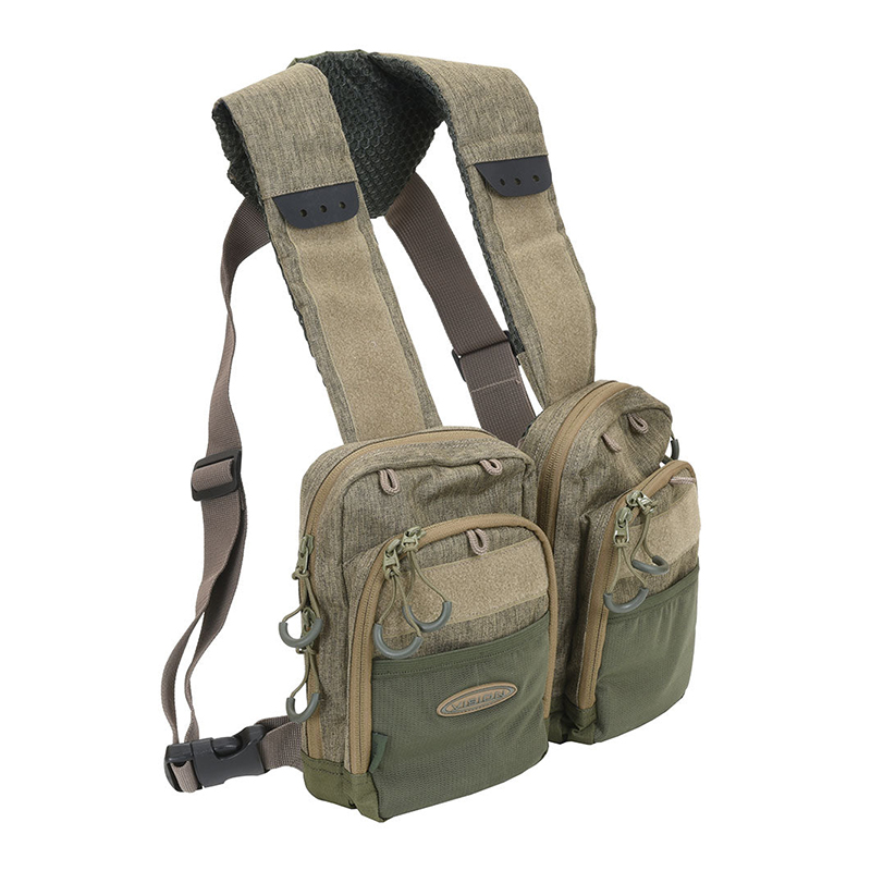Skulderstroppene er godt polstret og kan enkelt justeres for å sitte behagelig hele dagen ved elva eller langs sjøen. Øvre del av stroppene har borrelås-fester for avtakbare tilbehørsholdere, slik at du kan tilpasse oppsettet til ditt fiske. På baksiden sitter en praktisk klips for håv, så du raskt får fisken trygt i nettet når det gjelder.