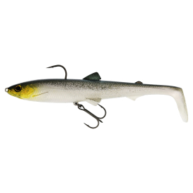 Den store paddelhale i kombinasjon med en slank hale gir en livlig, rullende bevegelse med tydelig belly flash, selv ved langsom innsveiving. R2F-versjonen har en solid gjennomgående wire-konstruksjon med et blyfritt vektet system. En sterk enkeltkrok i ryggen og en avtakbar treble på magen sikrer optimale krokfester. Ønsker du å fiske dypere? Fest et Switch Weight i frontøyet!