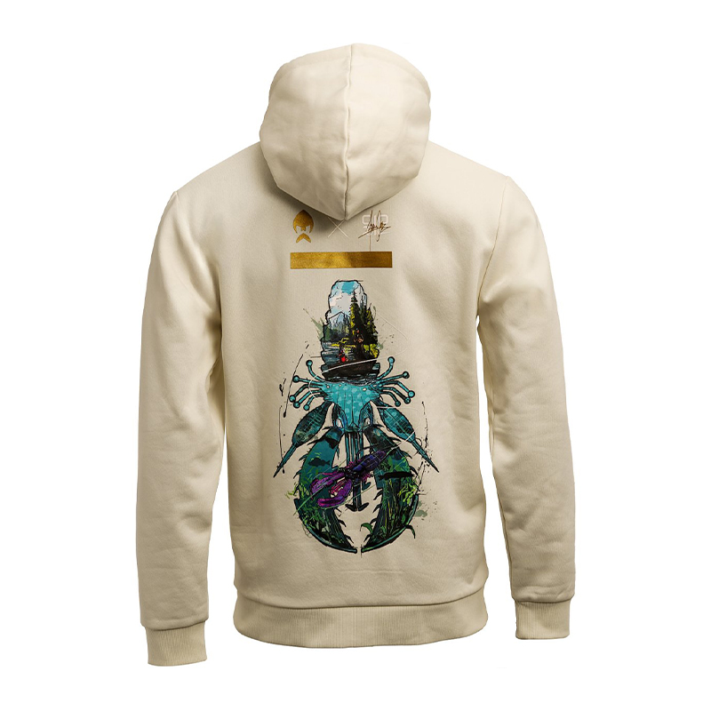 Den middels tykke kvaliteten gir god varme uten å bli for tung, noe som passer fint på kjølige sommerkvelder, vår- og høstfiske. Børstet innside gir myk og komfortabel følelse mot huden, og den taggfri nakkeprinten reduserer irritasjon ved lange dager med lag på lag. Hetten strammes enkelt med snor når vinden tar seg opp, og kengurulommen varmer kalde hender mellom kastene.