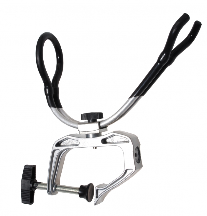 Stangholder med skruklemme. Har fast feste bak og foran, justerbar i innfestingen.